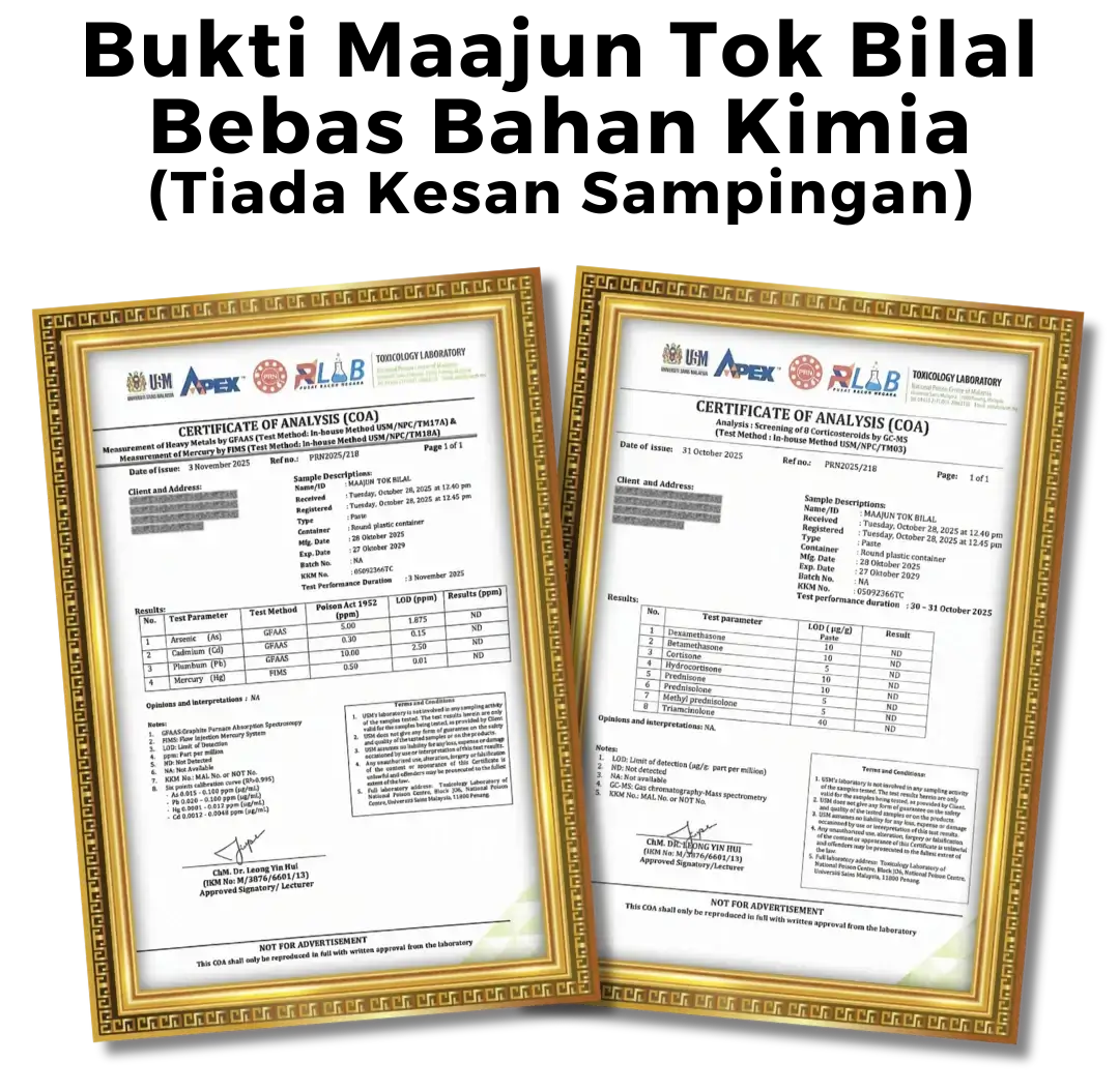 Anda tak perlu risau. ianya berbeza dari jamu/majun/ubatan kimia yang lain. Maajun Tok Bilal 100% diperbuat dari 100% herba. Tiada sebarang kesan sampingan.